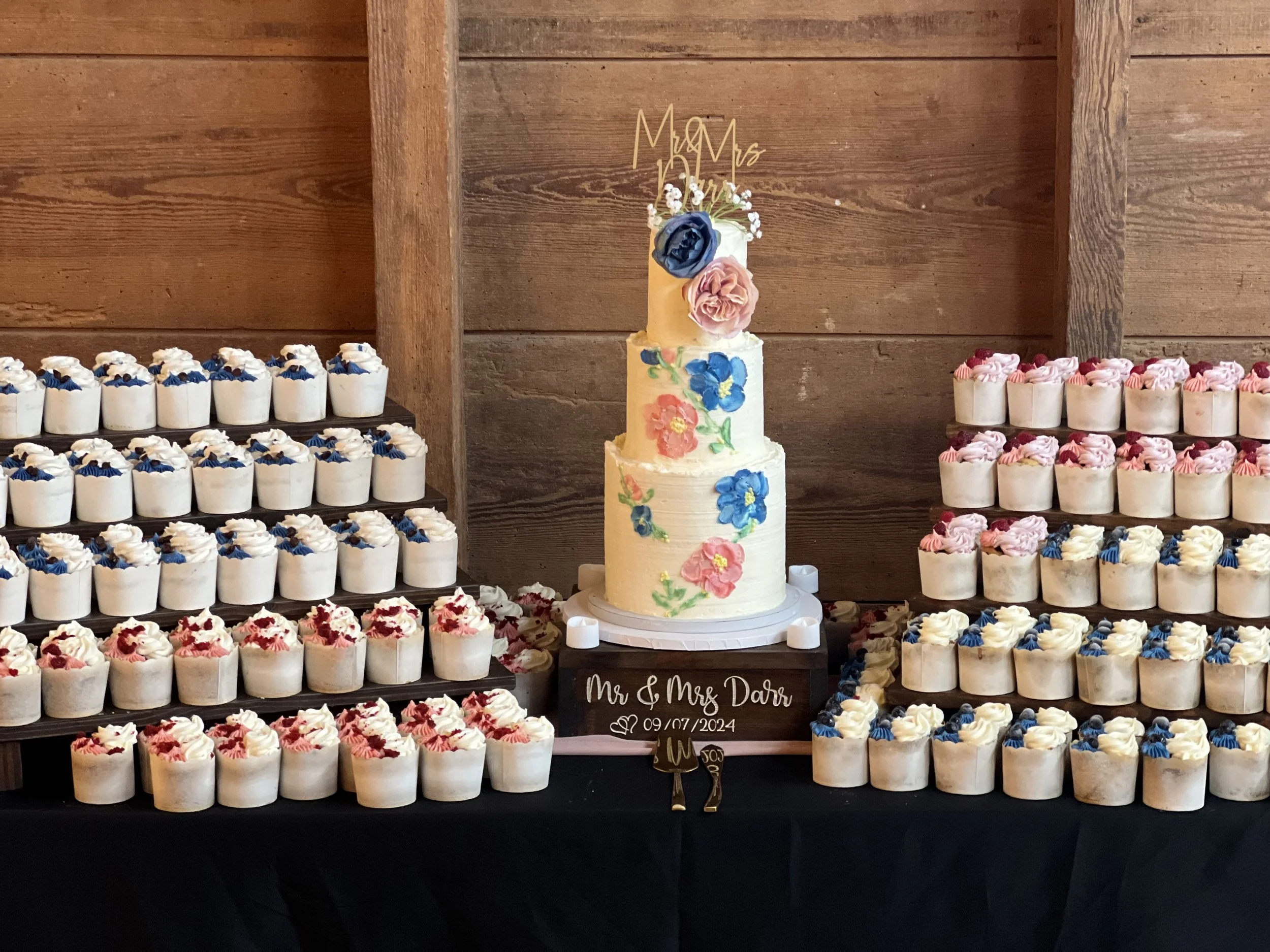 "Narima did a fantastic job on our wedding cake! I found her on Facebook and wanted to hire a local baker, and we couldn’t have been more pleased! She was such a pleasure to work with, and she made her passion and enthusiasm so clear. She cared about our wedding cake as much as we did. Narima was great with communicating, very responsive, and asked questions to find out exactly what we wanted. Not to mention how yummy the cake was! We got a little taste the day of our wedding, and then after we got back from our honeymoon, we took some from the freezer and kept eating it - so so good! We got the vanilla bean with fresh berries filling, and vanilla buttercream frosting. We just needed a small cake for us and for pictures, since the guests were getting other desserts. Narima worked with our coordinator to deliver the cake, and set it up so beautifully the evening of. It beautifully matched with the venue and our theme. As an added bonus, my husband and I were in the field across from the venue taking pictures that night with the photographer, and Narima drove by in her jeep after having just delivered the cake, so we got to “meet” her and wave as she drove by. So fun! Highly recommend Narima’s Cakery”